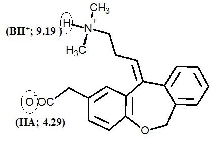 Olopatadine is zwitterionic in nature (Figure 1) and represented by two pKa values i.e., due to carboxyl group (HA; 4.29) and tertiary amino group (BH+; 9.19), therefore, the solubility of OP was checked in 0.1N HCL, 0.1N NaOH, de-ionized water and MeOH to get optimum response.