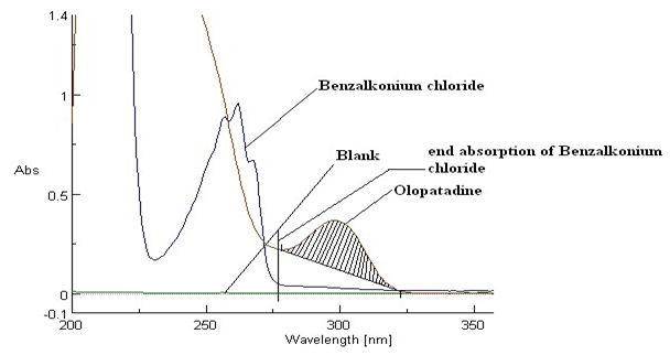 Estimation of OP using UV-method, based on dye formation of the drug with an acidic dye, has been reported in literature.4 The procedure seems to be cumbersome and expensive without advantage in sensitivity. In another study, validation of UV-visible Spectrophotometric assay methodhas been performed for the estimation of OP using 206nm as its wavelength maxima.5 The drug does not show spectral homogeneity at the corresponding wavelength. Moreover, validation of the method was reported by using magnesium as an assumed placebo which can never be a part of ophthalmic preparation. Another reported assay method,6 based on UV-derivative spectroscopic technique, claimed, its estimation in marketed formulation. Surprisingly, the placebo (i.e. Benzalkonium Chloride) strongly absorbs in the same region as that the drug; a fact which has been overlooked in the study.