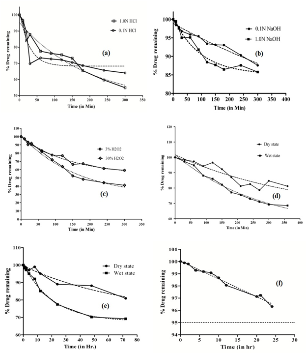 The peak AUC275↔320 was observed in each spectrum and the results were fitted to linear as well as non-linear models. The degradation rate constant for every stress condition was determined using best fit model of one-phase exponential degradation plot using PRISM®statistic software.