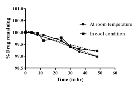 The analytical solution of OP was found stable in bench-top (≈25ºC) as well as in refrigerated (≈2-8ºC) conditions. The % change in assay value of OP was about 1.0 in both of the storage conditions as shown in the Figure 4. From the data, it was concluded that standard and sample solutions may be used up to 24 hr after preparation.