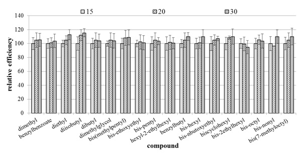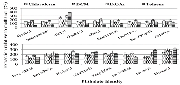 Clearly ethylacetate is the most ideal solvent for this extraction as it gives the highest efficiency for most of the compounds except the higher molecular compounds (bis-octyl-) where toluene seems prefererable. Importantly, the compounds detected in a previous study (bis-2ethyl-hexyl, dibutyl- and di-isobutyl-) seemed to extract better in ethylacetate.33 Thus ethylacetate was selected as the ideal solvent to be used in further experiments.