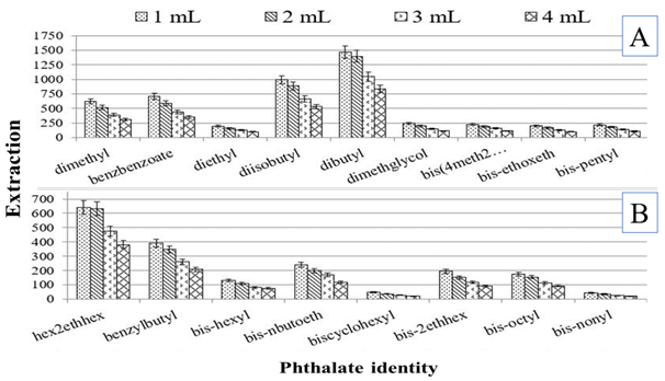 To the treated soil samples, different volumes of the ethylacetate were used to assess the effect of increasing the volume on the extraction of the phthalates from the spiked soil. The results obtained from the use of different volume are presented in Figure 2.
