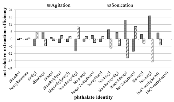 Sonication is one of the mostly preferred extraction technique for organic compounds bound on soils. However, this is mostly applied on aqueous extractions. To investigate the comparison of the two techniques on extraction efficiency, the pre-treated samples were suspended on equal volumes of ethylacetate and three samples were sonicated for 10 minutes while the other three were agitated for 30 seconds. Agitation could not be prolonged to prevent fatigue since the samples needed to be manually supported on the vortex mixer. Figure 3 shows the comparison of 10 minutes room temperature sonication and 30 seconds room temperature agitation. The net difference of each extraction technique was taken relative to the average obtained using about 15 seconds agitation as in sections 3.2 and 3.3 and plotted against each phthalic acid ester, hence the graph shows a different pattern of responses to the earlier figure where the intensity of the responses decreased down the order.