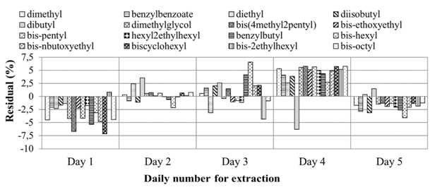 The extraction method was validated for reproducibility and repeatability using different three spiking levels of the PAEs, namely, 0.1, 0.5 and 1.0µg/mL respectively, and extracted in triplicates (n=9). Otherwise, the precision obtained throughout the study was also evaluated to assess the reproducibility of the method over 5 days (total number of 45 replicates), with fresh samples being prepared freshly on each day and run on triplicates. Figure 5 shows the reproducibility of the extraction for 0.1µg/mL spiking level, the lowest of the three spiking levels explored. The reason for the choice of the lowest spiking level was inspired by the fact that as the concentration gets lower, the precision of any method suffers. For ease of reference, the results are residuals of each days’ average to the acerage of the total combined replicates (n=45). The residuals are then taken as fractions of the total average.