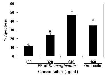 The total apoptotic cells including addition of early and late apoptosis were observed after 48 h treatment with ethanol extract of S. marginatum using annexin V-FITC assay kit (Figure 1). Ethanol extract showed statistically (p < 0.05) significant increase of apoptotic cells than that of quercetin (35%, 160µg/mL). Ethanol extract enhanced total apoptotic cells in range of 11-47% at the 160-640µg/mL of concentrations. However, treatment with ethanol extract shows concentration dependent apoptotic cells.
