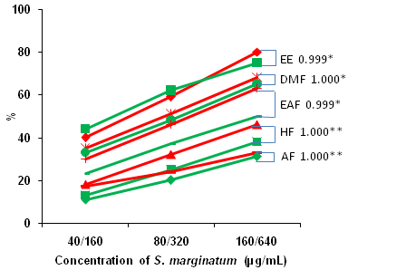 Total antioxidant activity of ethanol extract and its factions, HF, DMF, EAF and AF were exhibited in the Table 1. Among them, EE showed highest TAA (75%, 160µg/mL) than that of their fractions: 38% HF, 65% DMF, 50% EAF and 31% AF at the 160µg/mL. EE having 2, 1.2, 1.5 and 2.4 fold higher TAA than that of HF, DMF, EAF and AF, respectively. Even TAA at 20µg/mL of EE was better than that of their fractions. At the maximum concentration, TAA of EE was comparable to the standard of β-carotene (77 % 7.5µM/ml) and ascorbic acid (72% 20µM/ml). TAA of DMF was showed (65%, 160µg/mL) second highest than that of HF EAF and AF. However, R square value of EE and its fractions clearly revealed that TAA was dependent to their concentration (Table 1). Moreover, EE alone expressed RAA ≥1 against ascorbic acid when compared to their fractions. The results revealed that EE explored potential antioxidant activity than that of their fractions. The recent report exhibited that methanolic extract of S. marginatum having high content of phenolic which was explored effective antioxidant, metal ion chelation and cytotoxicity properties.17 Antioxidant activity of methanol, chloroform and hexane extract of S. marginatum were reported to posses radical scavenging activity through both electron and hydrogen transfer mechanisms.2
