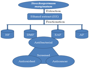 Exacted shade dried powder of Stoechospermum marginatum was directly immersed with ethanol solvent and extracted with Soxhlet apparatus. In term of secondary metabolites intrinsically presence in ethanol extract: alkaloids, tannins, saponins, triterpenoids, glycosides, phenols, Flavonoids, sterols, carbohydrates, proteins, fats and steroids. Ethanol extract was further fractionated with sequential solvents such as hexane, dichloromethane, ethyl acetate, and water. Ethanol extract and its solvent fractions were used to determine their antibacterial, total antioxidant and anticancer properties.