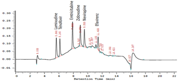 Under selected chromatographic conditions, the packs separation observed is presented in (Figure 1). According to the chromatogram given above, the Table 3&4 presents the retention times relative to each antiretroviral.