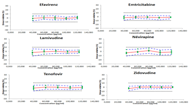 The method accuracy was assessed taking into account the total error (systematic error and the random error) strategy. The accuracy profiles were investigated (Figure 3). The analysis of individual graphs shows their accuracy profile, allowing us to conclude that the developed method is acceptable for screening and quantification of these compounds in same matrix under the same chromatographic conditions. This observation can be confirmed by different tolerance interval, which is included in the acceptation limit fixed at ±10% for the studied molecules, and was valid at all the levels. Notably, the accuracy profiles of four molecules (FTC, 3TC, NVP and TDF) stretched to approach the lowest limit of concentration fixed to 40µg/ml. Nevertheless, this could not make a barrier to the developed method, since in general this method has demonstrated good analytical responses at all the concentration levels in accordance with the limits of acceptation.
