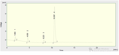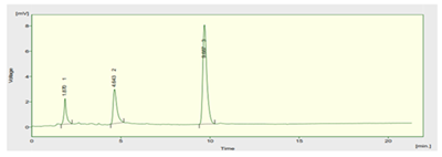 The selection of mobile phase was according to polarity and non-polarity of solvents. The methanol: acetonitrile: water was selected as mobile phase in ratio of 35:38:27 and was filtered on membrane filter (0.45μ) to remove degassing and were stirred for 10-15min.