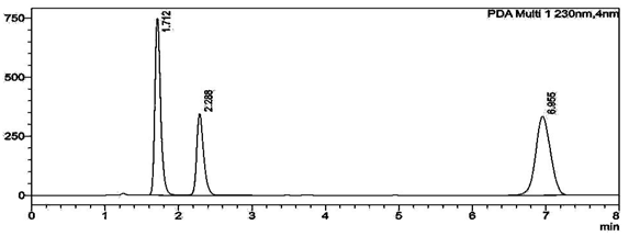 The chromatographic conditions were optimized to achieve the best resolution and peak shape for AML, HCT, and VAL. Different mobile phases containing acetonitrile in phosphate buffer were examined. With acetonitrile content 45% or less, the retention time for VAL was far (retention time >10min) and the resolution between the AML and HCT less than 2.5, with decreasing of acetonitrile more than 40% the retention time of VAL too far up to 15min eluted. On the other hand to give short time increased the acetonitrile to 60%, the retention time for valsartan was short (retention time < 5.5min) but the resolution between the AML and HCT less than 2.0, moreover phosphate buffers of pH 3.0-7.0 were tried but the peak shapes for the drugs were sufficiently symmetrical only for pH value below 4 and the resolution warmed over. Therefore, the mobile phase containing acetonitrile and phosphate buffer at pH 3.5 (55:45, v/v) was selected as optimal for obtaining well defined and resolved peaks with mean retention times of 1.7 , 2.2 and 6.0 min, for standard solution HCT, AML and VAL, respectively, as shown in Figure 2.