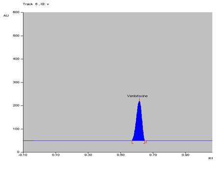 To determine the content of VLN in pharmaceutical dosage form, Contents of twenty capsules were crushed to make a uniform powder having label claim of 37.5mg. A quantity of powder which is equivalent to 37.5mg of VEN was weighed accurately and transferred into a 10ml calibrated volumetric flask; finally the volume was adjusted to the mark. The resulting solution obtained was then filtered, through 0.45µm filter for complete removal of particulate matter. 5ml of the filtrate was diluted to 25ml in the volumetric flask with the diluent for analysis. A single spot at Rf 0.61 was observed in the chromatogram of the drug samples extracted from conventional capsules. There was no interference from the excipients commonly present in the conventional capsules. The drug content was found to be 100.9% with a % R.S.D. of less than 2 viz; 1.01. The low % R.S.D. value indicated the suitability of this method for routine analysis of VEN in pharmaceutical dosage forms.