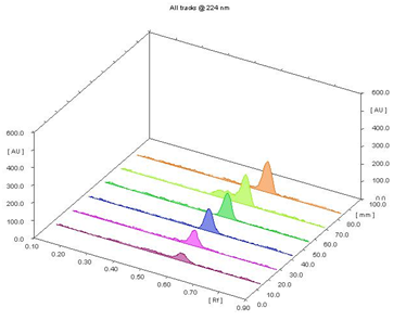 The proposed method has been validated for various parameters like linearity, accuracy, precision, sensitivity, reproducibility, repeatability and robustness as per ICH guidelines. The calibration curve obtained by plotting peak area against concentration showed linearity in the concentration range of 500-3000ng/µl per band and calibration curve constructed to be r2=0.998. The bulk assay for Venlafaxine hydrochloride was performed and the amount found is close to 100% when area was calculated for 1500ng/spot and six determinations. Calibration curve was constructed by plotting the peak area vs. corresponding drug concentration as shown in Figure 3 and 3-D linearity chromatogram is shown in Figure 4.