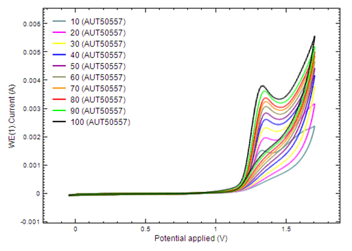 The relation between redox peak currents and square root of scan rate helped to calculate the electrochemical surface area by using following Randles Sevcik equation no. 1: