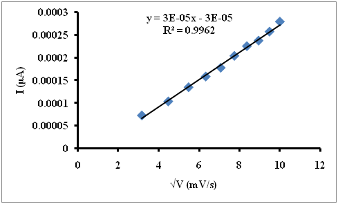 Effect of scan rate: The effect of scan rate on the peak current of RNH was investigated by cyclic voltammetry as shown in Figure 6. It was found that the peak current was proportional to the square root of scan rate over the range from 10 to 100mVs-1, providing further evidence that the electrode reaction of RNH at PGE modified with p-ABSA/CB (6) is diffusion controlled.3 Figure 7 shows a straight line plot of peak current vs. square root of scan rate. From the sharp shape of the voltammograms, an adsorption process seems likely. However, the slope log Ip vs. log v was 0.5846 as shown in Figure 8, which leads to the conclusion that the process follows diffusion control at this pH value. The expected theoretical value for this slope is 0.5 for diffusion control and 1 for adsorption control.30 From these results, a scan rate of 100mVs-1 was chosen for further studies due to the best peak definition in the presented voltammograms. The peak potentials shifted positively which implied the irreversible nature of the electrode reaction processes.