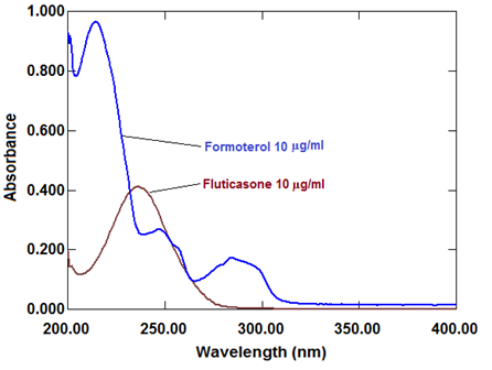 Amplitude modulation method: The zero order spectra was obtained as mentioned in simultaneous equation method. The amplitude of ratio spectra for fluticasone and formoterol at isoabsorptive point 232nm and 286nm were recorded respectively.