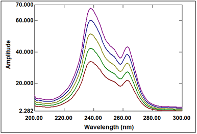 The λ max of both formoterol and fluticasone were determined and it was found to be 214 and 236nm respectively (Figure 3 & 4). Absorption value at these two wavelengths (λ1, λ2) of formoterol and fluticasone in the concentration ranges of 2-14μg/mL and 5–40μg/mL were calculated, respectively. The absorptivity of formoterol and fluticasone were calculated at each wavelength. The concentrations of formoterol and fluticasone can be obtained by applying Cramer’s rule and matrices in Equations. (1) and (2). Concentration of formoterol and fluticasone were calculated according to the following equations:
