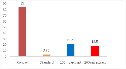 Diclofenac-Na like non-narcotic analgesic activity of the test extracts was investigated by the ability to protect a painful writhing syndrome in mice. The Writhing was consistently produced in mouse by an intraperitoneal injection of 0.7% aqueous acetic acid. Overnight fasted, healthy adult male albino Swiss mice weighing between 25 to 30gm in groups of four each were taken for present investigation. DMSO 1% solution of the test extracts were administered orally in a dose of 50mg/kg, 100mg/kg and 200mg/kg body weight respectively to the test groups animal. The control group of animals were given only DMSO 1% solution in the dose of 10ml/kg body weight. One group of animal was administered with Diclofenac sodium as standard, orally in a dose of 10mg/kg (b.w). After a gap of 30 minutes of the administration of the test extracts, all the groups of mice were given the writhing agent, 0.7% aqueous acetic acid, in a dose of 1ml/100gm (b.w) intraperitoneally. Five minutes after administration of acetic acid the number of writhing produced in these animals were counted for next 10 minutes and the number of writhing produce in the tested groups were compared with those in the control group and the percentage protection was calculated as show below (Table 1) (Figure 1 & Figure 2).