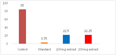 The different test extracts were administrated to the animals in the test groups at the dose of 50, 100 and 200mg/kg by oral route. Animals in the standard group received Indomethacin at the dose of 10mg/kg, by oral route. Control group animals were received 1% DMSO at the dose of 10ml/kg body weight. Thirty minutes after administration of the respective drugs, all the animals were challenged with 0.1ml of 1% carrageenan in the sub planter region of left hind paw. Paw volume was measured by using digital plethysmometer before administration of carrageenan and after 30min, 1, 2, and 3 hrs intervals. The efficacy of different drug was tested on its ability to inhibit paw edema as compared to control group. The percentage inhibition of paw edema was calculated by the formula as below (Table 2) (Figure 3).