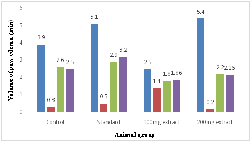 In the present study, anti-inflammatory activity described by Winter et al.,9 the possible anti-inflammatory actions of the extracts were investigated in comparison with the indomethacin administered experimental animals. The anti-inflammatory action was evaluated by using carageenan-paw induced edema. Measurement of paw volume was done by means of volume displacement technique using .Thin thread immediately after carrageenan injection and after 1, 2, 3, and 4hr.