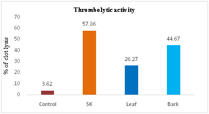 Clot lysis of blood samples of normal subjects by different concentrations of crude methanolic extracts leaf and bark of Sonneratia caseolaris. The clots were treated by four different concentrations of extracts such as 20, 10, 5 and 2.5 mg/ml and clot lysis % was 26.27& 44.67% of leaf and bark respectively (Table 3) (Figure 4).
