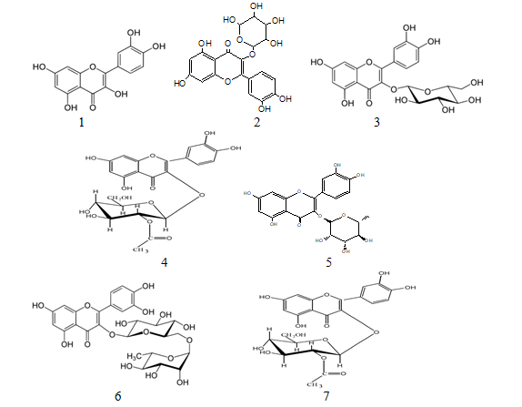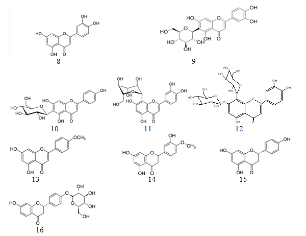 1:quercetin, 2:quercetin-3-O-pentoside, 3:quercetin-3-O-glucoside, 4:quercetin-3-acetyl-glucoside, 5:quercetin-3-O-rhamnoside, 6:quercetin-3-O-rutinoside, 7:quercetin-3-acetyl rhamnoside, 8:luteolin, 9:luteolin-6-C-glucoside, 10:apigenin-6-C-glucoside, 11:apigenin-8-C-glucoside, 12:apigenin-6-C-glucoside-7-O-glucoside 13:acacetin,14:hesperetin, 15:naringenin , 16:liquiritin