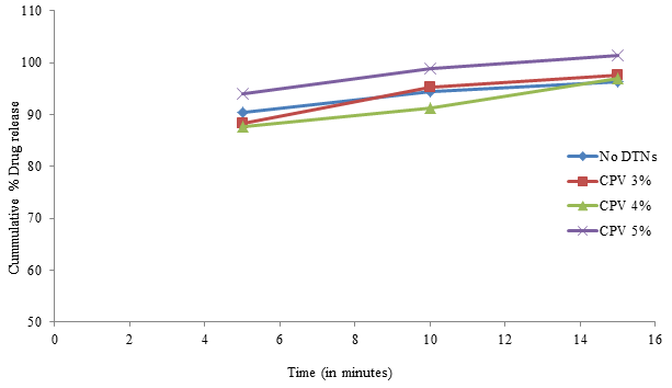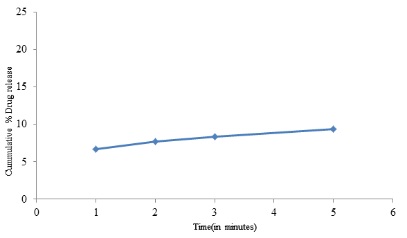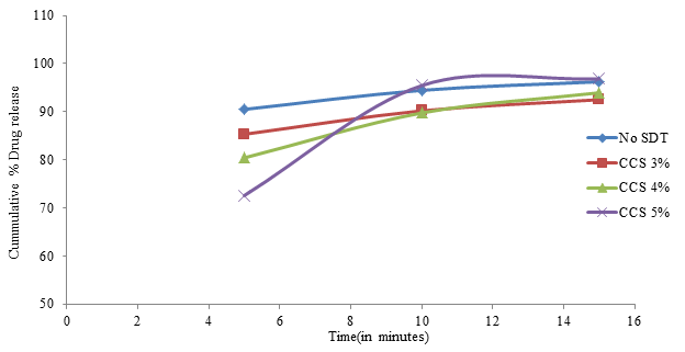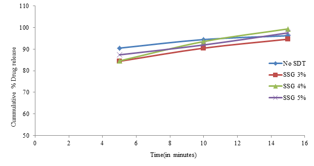 In-vitro dissolution tests were conducted using USP apparatus II (paddle) at 37±0.50C at a rotational speed of 50 RPM in 900 ml of 0.1N Hydrochloric acid (pH 1.2) medium for all formulations. A 10 ml of sample was taken from the medium after 5, 10, and 15 minutes and the percent drug release was calculated by measuring absorbance spectrophotometrically at 316 nm. The cumulative percent drug release in all the formulations after 15 minutes showed satisfactory results. It was found in the range of 92.49±1.78 % to 101.32±1.54 %. The result showed that there is no significant difference in cumulative percent drug release due to both the types and concentration of superdisintegrants used (P>0.05). A comparative dissolution profile of different batches is shown in Figure 3.6(A)–3.6(C).