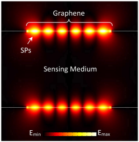 Figure 4 Electric field distribution on the top of one of the graphene nanoribbons in the proposed biosensor. SPs: Surface Plasmons. Emin, Emax: Minimum and Maximum Electric Field, respectively.45