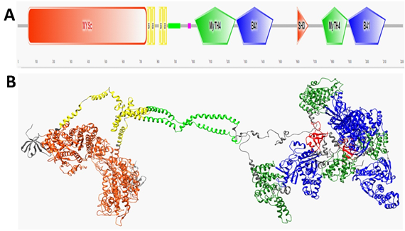 Figure 1 A schematic view of human MYO7A and the homology model of the human MYO7A homodimer are shown. (A) The domain structure of MYO7A predicted using SMART (http://smart.embl-heidelberg.de/). Motifs from left to right: motor domain (MySc, red); IQ motifs (yellow); coiled-coil region (green); low complexity area (magenta); MyTH4 domain (green); FERM1 domain (B41, blue); SH3 (orange), MyTH4 (green); and FERM2 domain (B41, blue). (B) A ribbon homology model of MYO7A homodimer is shown. Domains colored similarly to that of Panel A. Domain sizes are shown in Table 2. Also, the residues 632–639 are in the actin-binding region, residues 158–165 are involved in binding to ATP, and the residues 858–935 are in the single alpha-helix region formed by charged residues.
