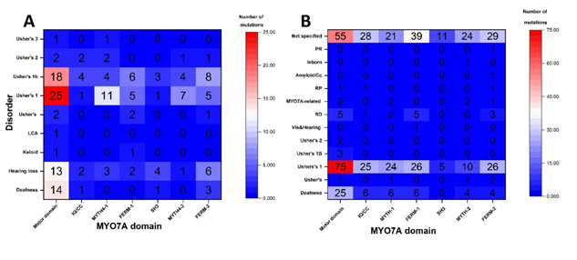 Figure 3 Heatmaps presents the relationships between the location of missense changes in MYO7A domains and disease phenotypes. (A) A heatmap shows the statistical distribution of HGMD missense alterations over MYO7A structural domains. (B) A heatmap shows the statistical distribution of ClinVar missense alterations over MYO7A structural domains. The numbers of the heatmap correspond to the number of HGMD or ClinVar missense mutations for given structural domain and disease phenotype.