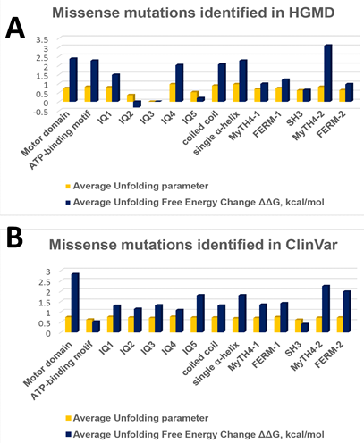Figure 4 The statistical distribution of averaged unfolding propensities and averaged free energy changes of missense mutations per each MYO7A domain. (A) Missense mutations identified in HGMD. (B) Missense mutations identified in ClinVar.