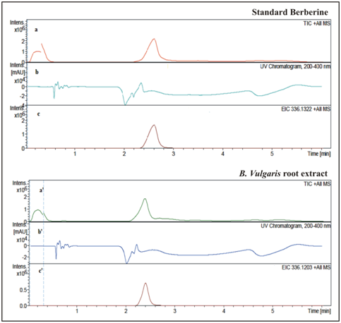 Figure 1 Comparison of standard berberine and root extract of B. vulgaris via UPLC-HRLC-MS analysis (a-a’) Total ion counts vs. acquisition time (min); (b-b’) UV chromatogram; (c-c’) Extracted ion counts vs. Acquisition time (min).
