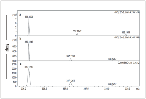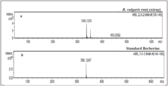 The result showed that the exact mass of berberine content of B. vulgaris ([M-H]+ m/z 336.1226) was identical to that of the standard berberine ([M-H] + m/z 336.1247), matching the theoretical composition of C20H18NO4 ([M-H]+ m/z 336.1230) (Figure 2). The UV absorbance spectra of sample (root extract of B. vulgaris) and berberine during LC-UV-MS were recorded and absorbance maxima were noticed at 267nm (Figure 1). The inclusive results of present investigation has proved that HR-LC/MS is the highly precise analytical technique which can be extensively used for isolation and quantification of berberine content in the root extract of B. vulgaris.