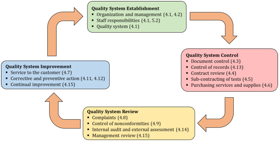 The laboratory is a complex system, involving many steps of activities and many people. The key workflow steps in a pharmaceutical laboratory include sampling, sample handling, testing, reporting and record maintenance and are shown in (Figure 1). There are many procedures and processes that are performed in the laboratory and each of these must be carried out correctly in order to assure accuracy and reliability of test results. Therefore, the QMS model, which looks at the entire system, is very important for achieving good laboratory performance. The QMS is defined as a ‘management system to direct and control an organization with regard to quality’.2,3 The QMS consists of documentation of the laboratory policy and objectives, system procedures and instructions for assuring the quality of its results to meet safety and regulatory requirements and to satisfy the needs of the customers. A pharmaceutical laboratory which is developing framework for the QMS must establish, document, implement and maintain a QMS appropriate to the scope of its activities, including the type, range and volume of testing, as well as maintain its effectiveness in accordance with ISO 17025. All essential elements of the QMS are covered by ISO 17025 in two distinct sections: management requirements and technical requirements. Management requirements are related to the operation and effectiveness of the QMS within the laboratory. Technical requirements address the competence of personnel, equipment, testing procedure and reporting of test results. An effective QMS may be established by understanding the dynamic relationships of management and technical requirements. A structured approach to the establishment, control, review and improvement of the QMS is presented in (Figure 2).