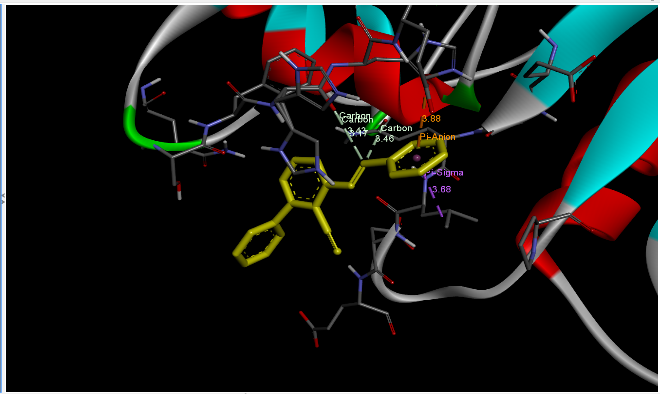 The process of docking, interaction, and binding the structure of ligand with protein has executed using Auto dock Vina software. Preparation of ligands and proteins- Chem-draw software was used to determine the structure of the Schiff bases in MOL format. The protein structure was downloaded in PDB format using RCSB PDB. Using Auto dock Vina, water molecules and ligands already present in the proteins were removed, and hydrogen atoms were added and saved in PDB format. 2D and 3D representation of the compounds have represented by Figure 3–5. Prediction of active site- In structure-based drug design, the active site prophecy is critical. The program BIOVIA Discovery Studio was used to calculate the coordinates of the proteins' binding locations.
