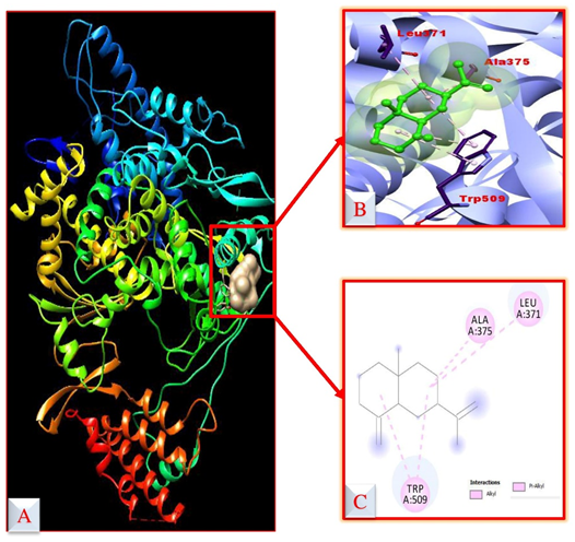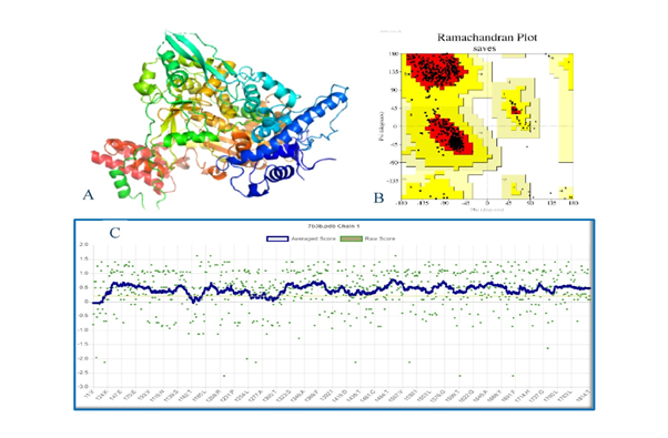 Using the SAVES 6.0 server, the crystal structure of the SARS-CoV-2 RdRp complex with Remdesivir was obtained and verified.14 The crystal structure of receptor protein RdRp (PDB:7B3B) of SARS-CoV-2 presented in Figure 1A, the Ramachandran plot of SARS-CoV-2 RdRp PDB:7B3B VADAR (Volume, Area, Dihedral Angle Reporter) shown in Figure 1B, and the PDB:7B3B structure validation by Verify3D presented in Figure 1C. The structural quality of the target protein was determined using PROCHECK server. The CASTp website was used to assess whether amino acids were present in the active site. The selected EO bioactive chemicals' structure data format (SDF) was obtained from the PubChem database and then converted to PDB format using Open Babel.15 Chem sketch data are presented in Figure 2. Using Autodock 4.2 tools, the protein and ligands were converted to PDBQT format.16 The common drug Remdesvir, which has demonstrated inhibitory actions against RdRp, was downloaded and compared. Using Autodock 4.2 and AutodockVina, all separated chemicals were docked into a 3D X-ray structure.17 The Broyden-Fletcher-Goldfarb-Shanno algorithm was used by AutodockVina. Finally, Bovia Discovery Studio Visualizer was used to display the binding complexes. Additionally, the SwissADME website measured Adsorption, Distribution, Metabolism, and Excretion (ADME) characteristics and pHCSM measured toxicity level.18