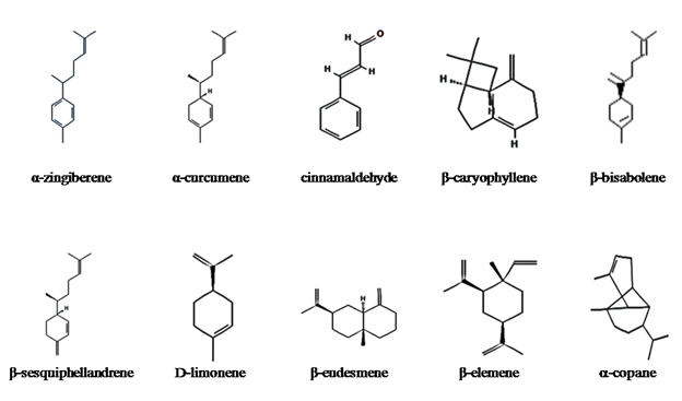 The yield of EO from AK was 0.33% (w/w), and GC-MS analysis revealed a total of 52 components for EO (Table 1). The primary constituents that were determined to be present included α-zingiberene (12.3%), α-curcumene (9.2%), cinnamaldehyde (6.7%), β-caryophyllene (6.2%), β-bisabolene (6.1%), β-sesquiphellandrene (4.9%), D-limonene (4.1%), β-eudesmene (3.9%), β-elemene (3.4%) and a-copane (3.5%). The GC-MS chromatogram is given in Figure 3.