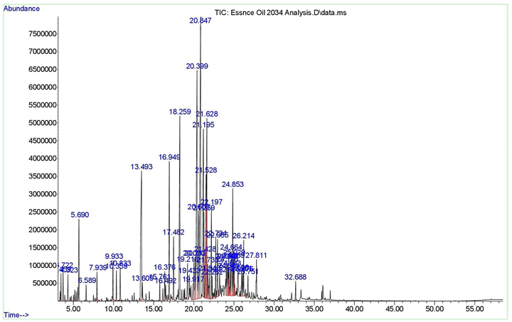 GC-MS was carried out to isolate and identify the constituents of AK essential oil (Agilent 7890B GC with 5977A MSD, Agilent, USA). An effective separation was achieved using HP-5ms (5% diphenyl-95% dimethyl polysiloxane) capillary column (30m x 0.25mm ID and 0.25μm film thickness). The optimal oven temperature was programmed to start at 80°C for 2minutes, then rise to 220°C at a rate of 4°C/min, and lastly to 280°C at 5°C while maintaining the ultimate temperature for 5minutes. The flow rate of the carrier gas, helium, was kept constant at 1ml/min. The temperature of the MS transfer line was set at 280°C while the injector was set at 220°C. 1μl of EO samples were injected with a 10:1 split ratio. Prior to injection, EO samples were dissolved in 10% v/v hexane. The 70ev ion source was used in EI mode to achieve fragmentation within the mass range of 50-550m/z. By matching the mass spectra to those in the NIST 14.1 library, all the components of essential oils were identified. By using the instrument software MassHunter, the abundance of EO components was quantified as a relative percentage of the total peak area (TIC). By analysing EO using GC-FID under the same conditions as GC-MS, each component's retention index (RI) was calculated. Chromatography of a mixture of homologous series of n-alkanes C6–C24 was also carried out at the same time.
