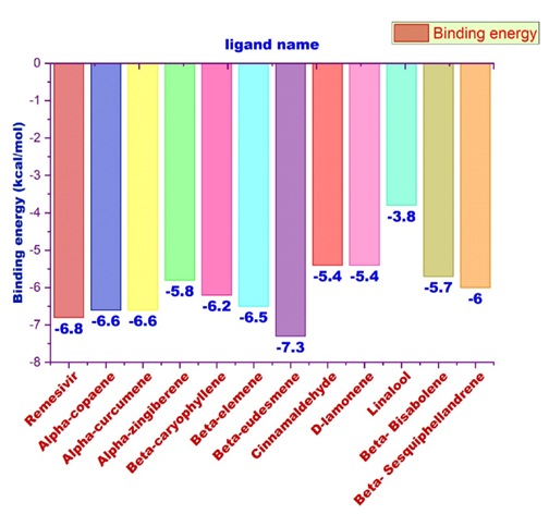 In addition to in vitro investigations, other researchers suggest that certain chemicals found in different EOs may have anti-Covid-19 infection properties.11 The replication of RNA from an RNA template typically requires the enzyme RNA dependent RNA polymerase (RdRp), and there is a strong sequence similarity (96%) between SERS-CoV and SARS-CoV-2 for RdRp.12 The agents that target the RdRp of SARS-CoV may therefore also target RdRp of SARS-CoV-2. Remdesivir is a frontline medication for SARS-CoV-2 infection and a possible RdRp inhibitor.13 In light of this, the current investigation was carried out for the first time to identify and quantify the bioactive components of EOs from AK and evaluate their antagonistic potentialities against the RdRp enzyme from the SARS-CoV-2 virus using in silico molecular docking.