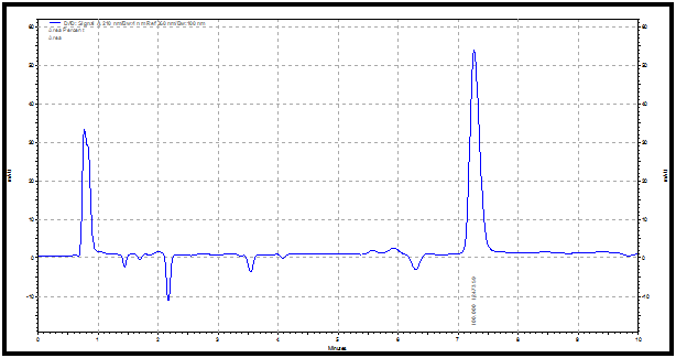 Artemisinin content was quantified by using isocratic analytical HPLC Agilent (1200 infinity series) equipped with an autosampler. The HPLC column was RP columns Eclipse Plus C18,4.6x100mm, 3.5 Make Agilent. The column oven was set at 250C. The mobile phase for artemisinin elution was acetonitrile: water (50:50 v/v) at a flow rate of 1mlmin−1 and UV detection at 254nm. 1mgml−1 stock solution of standard artemisinin was prepared in methanol. For the calibration curve, 20–100μl of standard solution of artemisinin was applied in triplicate onto the HPLC. The peak areas were recorded and a calibration curve of artemisinin was prepared by plotting peaks area against concentrations. Calibration graph was prepared from different concentration of standard of Artemisinin and concentration of unknown sample was calculated by using the Y equation y=20266x - 5664.R²=0.914 generated from standard curve. The retention time of artemisinin in above solvent system observed at 7.3min.