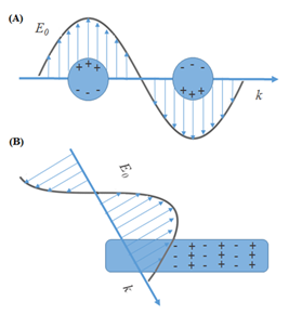 Figure 1A illustrates the local surface plasmon resonance mode (LSPR), in which the electromagnetic wave induces a force on the electrons of the metal conduction band and promotes its oscillations, nanostructures with dimensions smaller than the wavelength of the light support LSPR phenomenon. Figure 1B shows the propagation surface plasmon resonance mode (PSPR), in this case the metal structures have at least one dimension that approaches the excitation wavelength, and then the plasmons propagate for distances of the order of 10-100μm along the metal-dielectric interphase.4 Silver, gold, lead, copper, tin, aluminum and alloys make from these metals support the plasmon resonance phenomenon from the UV-Visible regions to the near IR of the electromagnetic spectrum.3,5