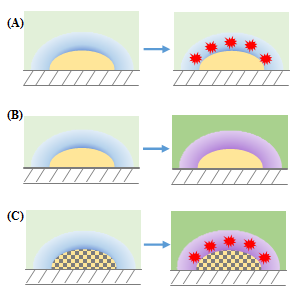 Figure 2 Analytical chemistry detection strategies: (A) molecular adsorption on metal particle surface, (B) refractive index change of the bulk solution by the increment of chemical species concentration and (C) synergic combination of optical and surface properties of metals when they form alloys: changes of the refractive index of the phases and molecular adsorption enhances.