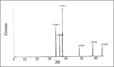 X-ray diffraction study: The X-ray diffraction pattern of as-synthesized ZnO powder was recorded using an X-ray diffractometer (BRUKERD8 Advance XRD, AXS GMBH, Karisruhe, West Germany) equipped with Cu target for generating CuKα radiation (wavelength: 1.5406 A°). The applied accelerating voltage, and the current were 40 kV, and 30 mA, respectively. The instrument was operated under step scan type with step time, and 2θ degree as 1 sec, and 0.0200, respectively over 2θ range of 4° to 64°.