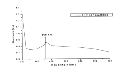 Where, EeV represents band gap energy in electron volts, and λ is absorption wavelength in nm. The band gap energy thus calculated for synthesized ZnO nanoparticles was 3.44 eV.