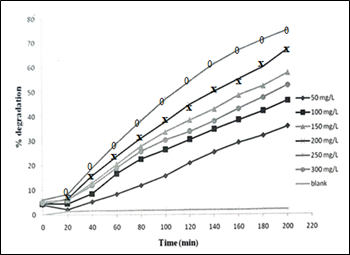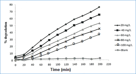 Effect of methylene blue concentration: To explore the effect of substrate (MB) initial concentration on its degradation, experiments were performed by varying initial concentrations MB from 20 to 100 mgL-1. The plots of MB percent degradation as a function of time (min) (optimum catalyst load: 250 mgL-1; pH: 10), using varying initial concentrations of MB, are shown in Figure 10. The percent degradation of MB was found to decrease with its increasing initial concentration. It could be because for the given catalyst load, with increasing concentration of MB, the availability of surface active site per dye molecule decreases. Besides it, at higher dye concentration, due to the absorption of some UV radiation by dye molecules in solution, the intensity of photons reaching at the catalyst surface diminishes leading to a decreased degradation rate of methylene blue.