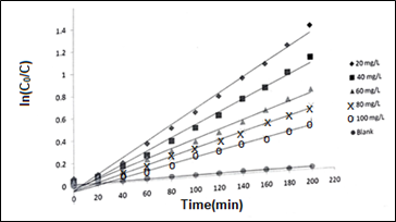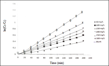 Figure 11 Plots of ln(C0/C) as a function of time (min) at different initial concentration (C0) of MB (optimum ZnO load: 250 mgL-1, and pH: 10).