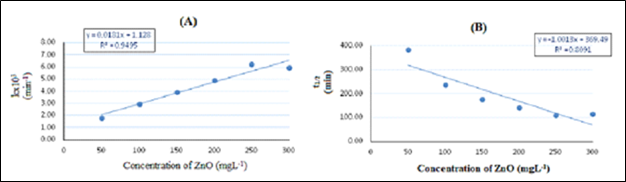 Figure 6 (A) Plot of methylene blue photocatalytic degradation rate constant k(min-1) versus concentration of ZnO. (B) Plot of methylene blue half-life time t1/2 (min) versus concentration of ZnO. (MB dye initial concentration 20 mgL-1, optimum pH 10; under UV irradiation).