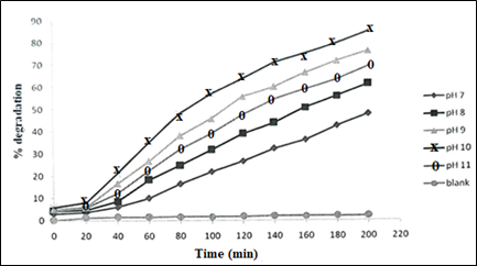 Figure 7 Plots of percent degradation of MB as a function of time at varying solution pH under UV radiation (MB initial concentration 20 mgL-1).