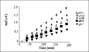 Figure 8 Plots of ln(C0/C) as a function of time (min) at varying solution pH under UV radiation [MB initial concentration (C0): 20 mgL-1; catalyst load : 250 mgL-1].