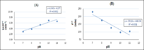 Figure 9 (A) Plot of methylene blue (MB) photocatalytic degradation rate constant k(min-1) versus solution pH. (B) Plot of methylene blue half-life time t1/2 (min) versus solution pH. [MB initial concentration (C0): 20 mgL-1, catalyst load: 250 mgL-1].